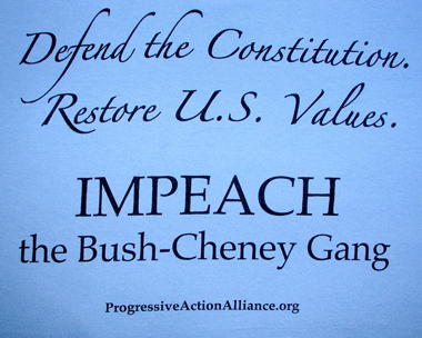 This "Defend the Constitution" shirt is light blue, with all the graphics in black. The frame we're using for this shirt design is supporting some universal values that everyone can relate to, and this means throwing Bush & Cheney out.